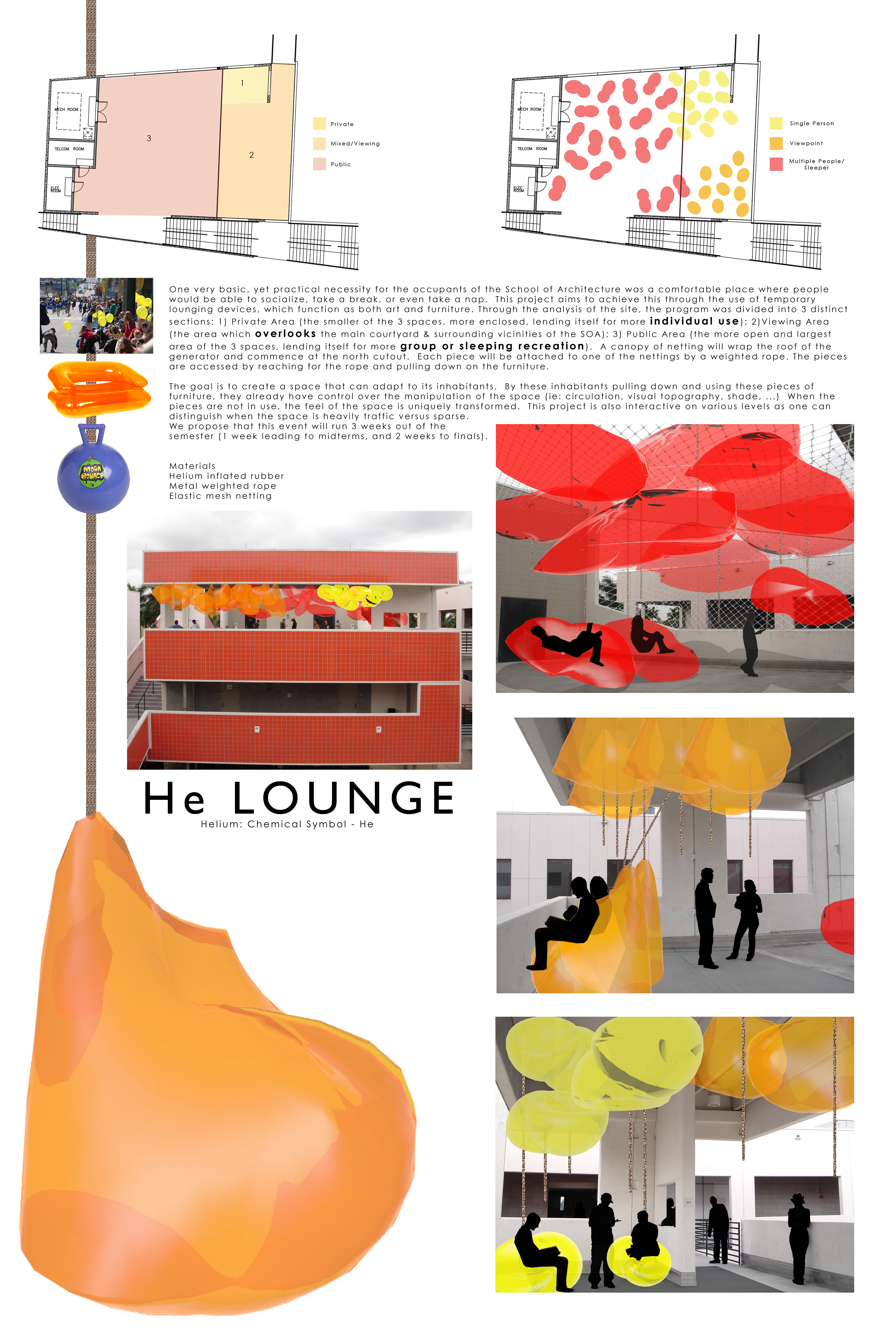 One very basic, yet practical necessity for the occupants of the School of Architecture was a comfortable place where people would be able to socialize, take a break, or even take a nap. This project aims to achieve this through the use of temporary lounging devices that are filled with helium, which function as both art and furniture. Through the analysis of the site, the program was divided into 3 distinct sections: 1) Private Area (the smaller of the 3 spaces, more enclosed, lending itself to more individual use), 2) Viewing Area (the area which overlooks the main courtyard and surrounding vicinities of the SOA), 3) Public Area (the more open and largest area of the 3 spaces, lending itself for more group or sleeping recreation). A canopy of netting will wrap the roof and each piece will be attached to one of the nettings by a weighted rope.