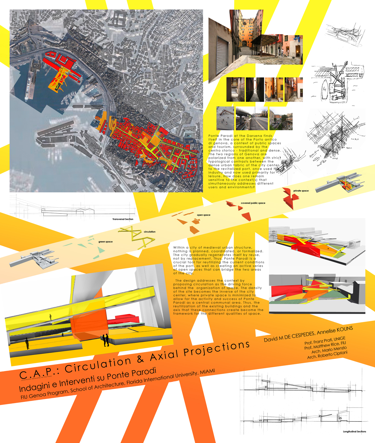 The design addresses the context by proposing circulation as the driving force behind the organization of space. The density of the site becomes the inverse if the city center where private space is minimized to allow for the activity and success of Ponte Parodi as a central communal area. Thus the re-utilization of the existing buildings and the axis that these connections create become the framework for the different qualities of space.