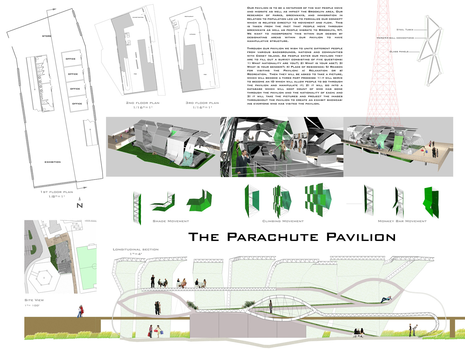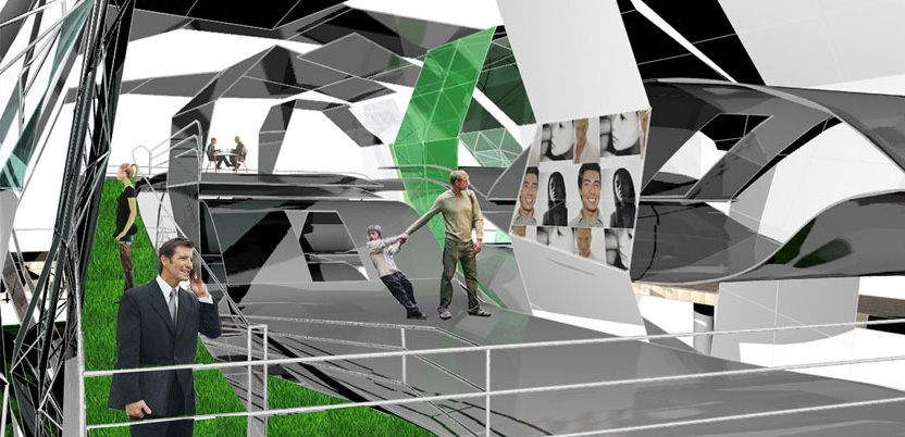 Competition sponsored by the Van Alan Institute of New York. People are constantly in motion… from point A to point B, regardless of the distance spanned. Movement and flow were the main conceptual ideas used, which led from inspiration of the history of Coney Island along with research and analysis of parks, green ways, and immigration in relation to population. The goal was to create an interactive, user-inspired space to unite individuals from various backgrounds. An assigned IF/THEN study, in which certain ideas where proposed and then further explored, aided greatly in the early design process. The user becomes the focus and manipulator — constantly changing space through interaction and taking part in the visual projection of visitors.